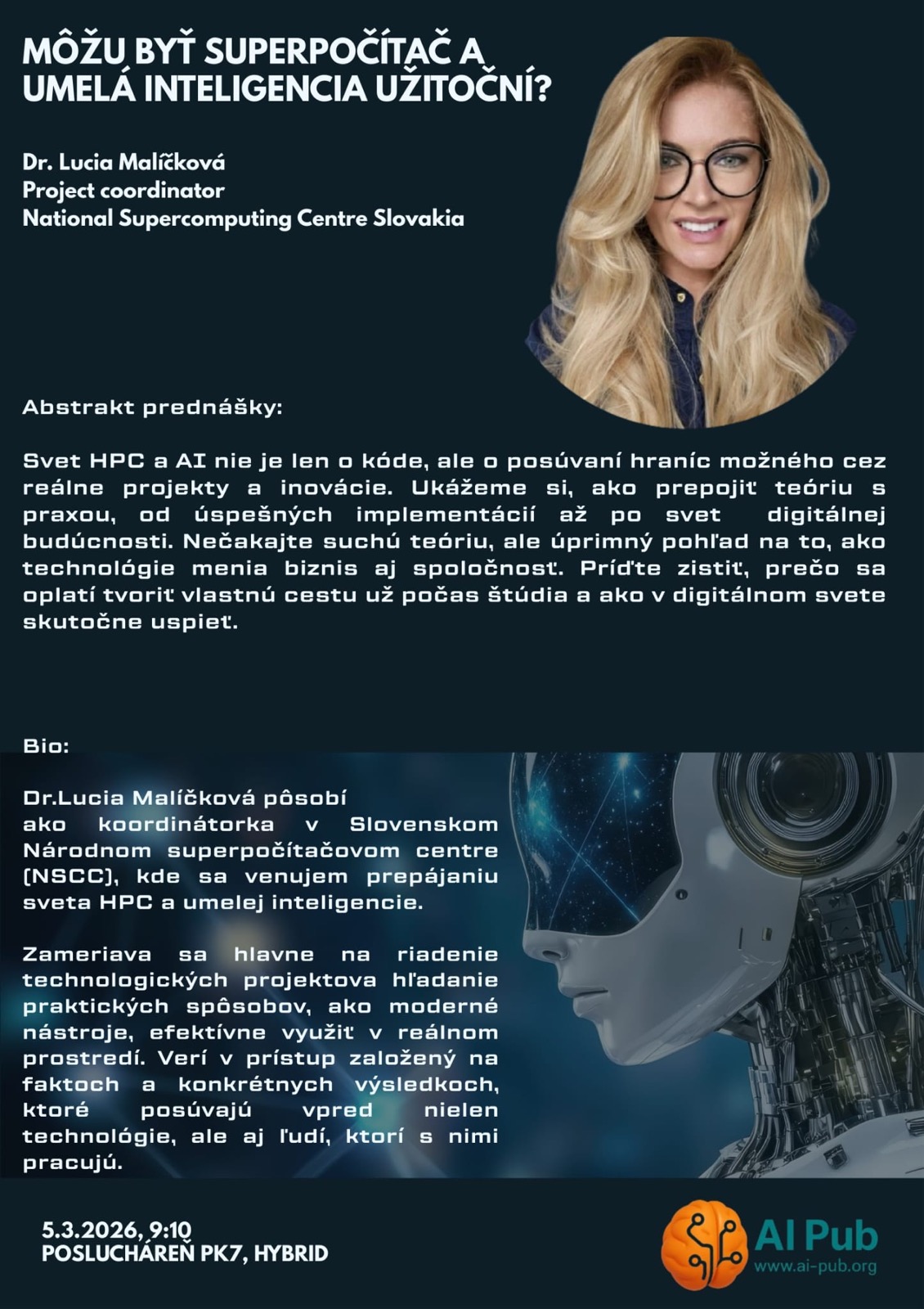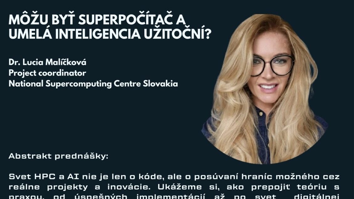 Dňa 5. marca 2026 sa na Technickej univerzite v Košiciach (TUKE) uskutočnila odborná prednáška Dr. Lucie Malíčkovej z Národného superpočítačového centra (NSCC) s názvom „Môžu byť superpočítač a umelá inteligencia užitoční?“. Podujatie sa konalo v posluchárni PK7 v hybridnom formáte (online aj prezenčne) a zúčastnilo sa ho 110 študentov TUKE.